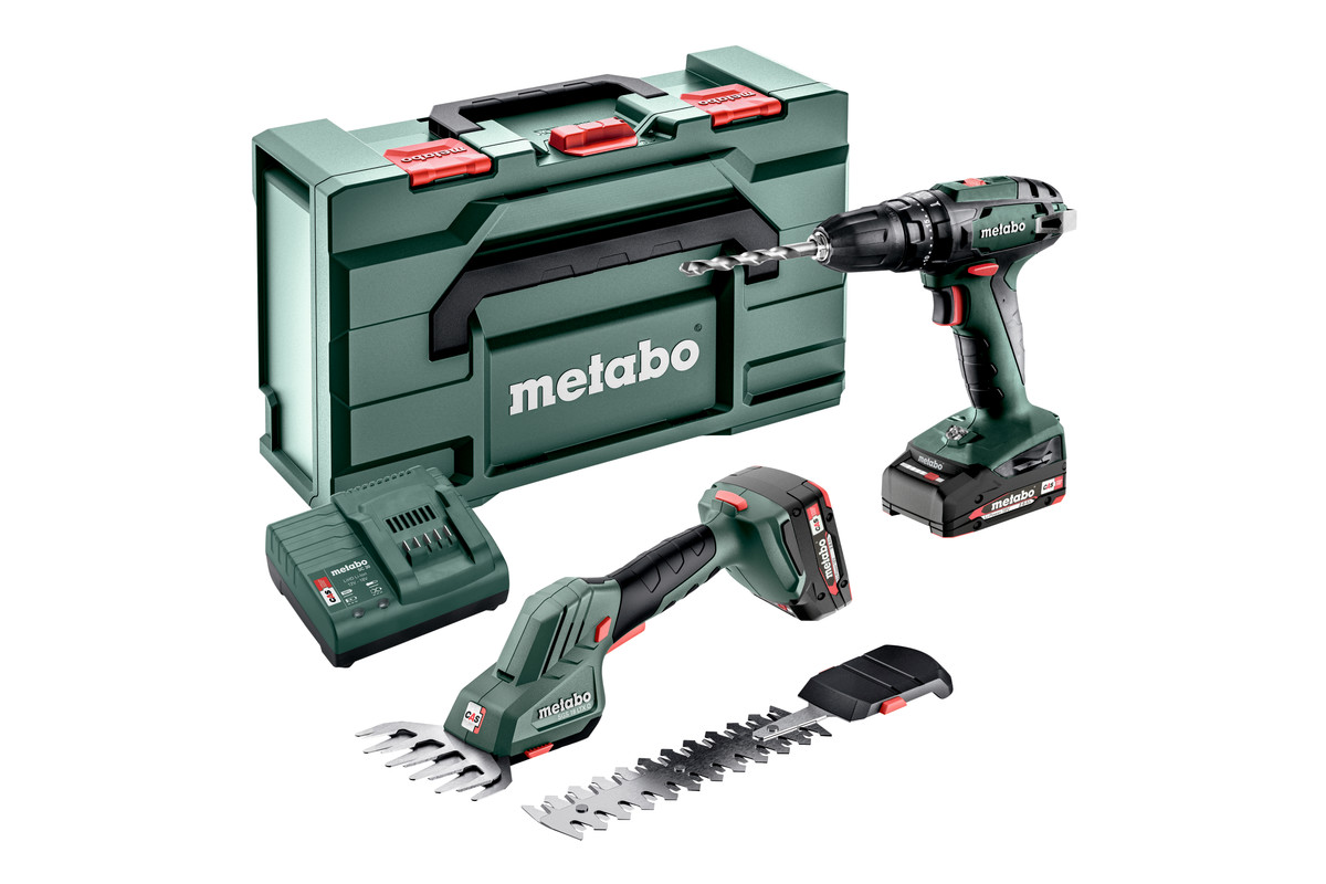SB 18, SGS 18 LTX Q, 2 x LiPower accu-pack (18 V/2,0 Ah), lader SC 30, metaBOX 165 liter, grasmes 11,5 cm, mes voor buxusschaar 20 cm