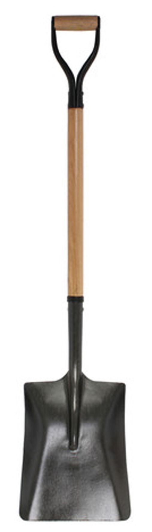 Ijzeren ballastschop met rechte onderzijde voor het tillen van (middel)zwaardere materialen. Voorzien van houten steel en D-greep.Â