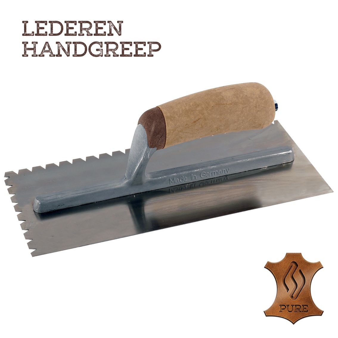 Super Prof Pure lijmspaan met driehoeksvertanding voor het verlijmen van tegels. Gehard en speciaal gepolijst RVS blad, sterke en lichtgewicht aluminium ang.